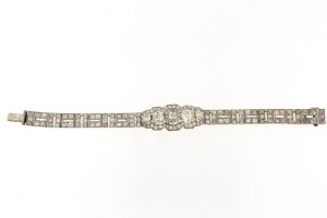 (Français) BRACELET ART DECO EN OR GRIS ET DIAMANTS COMPOSE DE 3 DIAMANTS PRINCIPAUX TAILLE ANCIENNE DE 1.16 CARAT, 0.90 CARAT ET 0.70 CARAT ENVIRON ET DEUX DIAMANTS TAILLE ANCIENNE POUR 0.50 CARAT ENVIRON CHAQUE PUIS DE PAVAGE DE DIAMANTS POUR ENVIRON 6.7 CARATS SOIT UN TOTAL D’ENVIRON 10 CARATS,