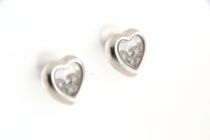 (Français) Puces d’oreille Happy Diamonds de la maison Chopard or blanc 18ct , de la collection actuelle avec fermoirs alpa, boucles vendues sans écrin mais avec certificat d’origine, signées maison Chopard. Bijoux composé de 6 diamants = 0.34cts. Valeur neuf 5000euros